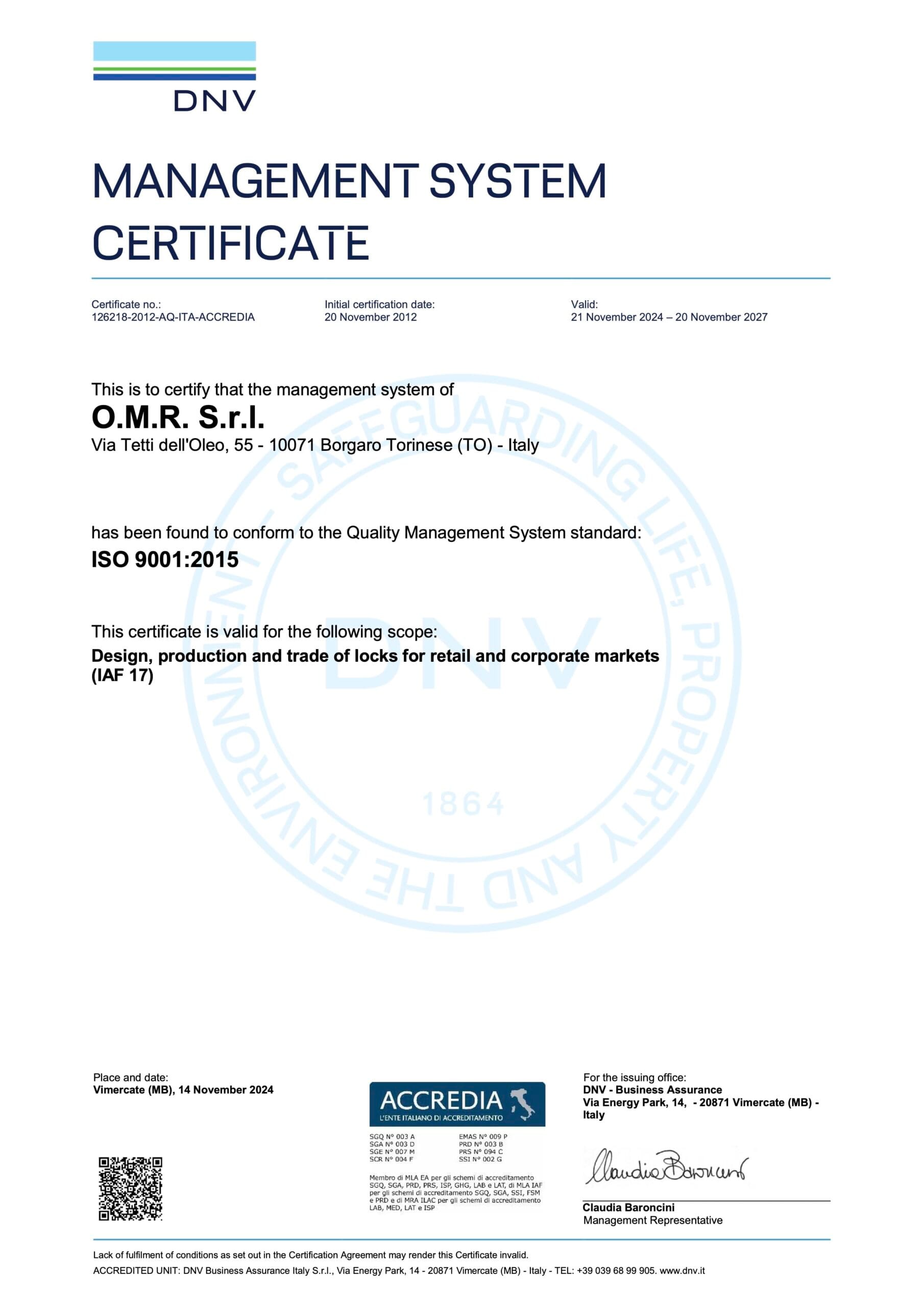 La experiencia adquirida y la búsqueda continua de soluciones innovadoras otorgan a esta empresa el reconocimiento adecuado por la calidad y la estética de sus productos: O.M.R. cuenta con la certificación ISO 9001:2000 desde el 17 de enero de 2002.